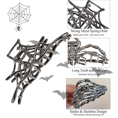 3 PcsBlack Spider Web Skeleton Hand Skull Hair Claw Clips for Women And Girls, Hiphop Metal Large Medium Size for Thick Thin Hair, Headband Barrette for styling Hair Accessories Party Gift (Black Gun)